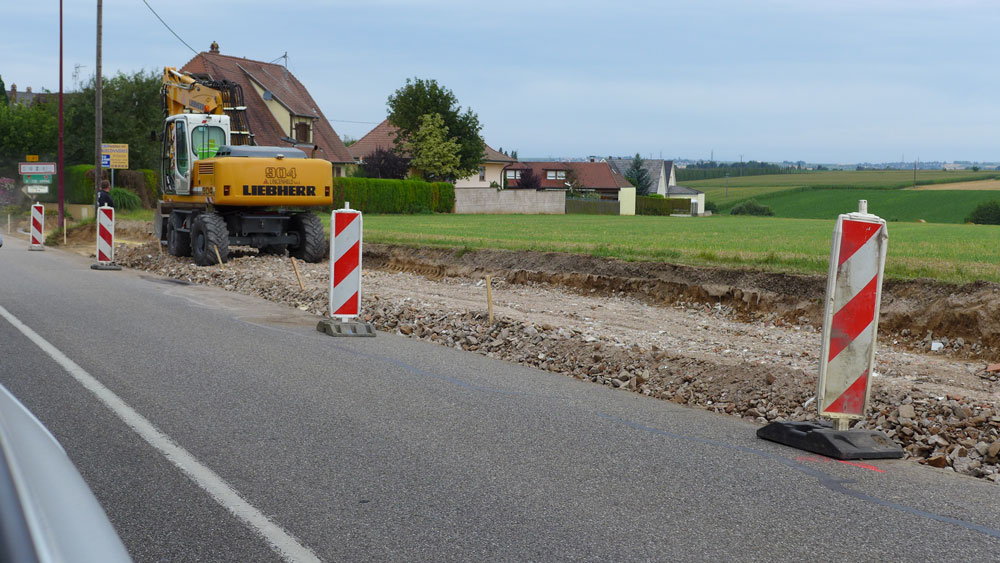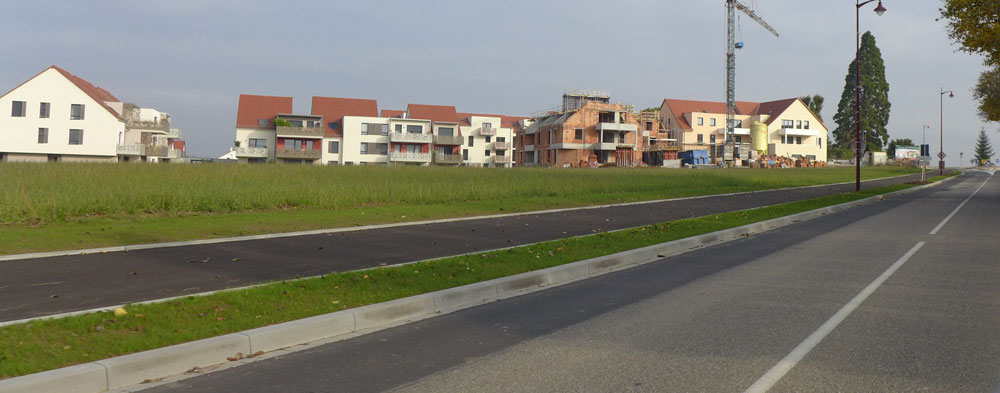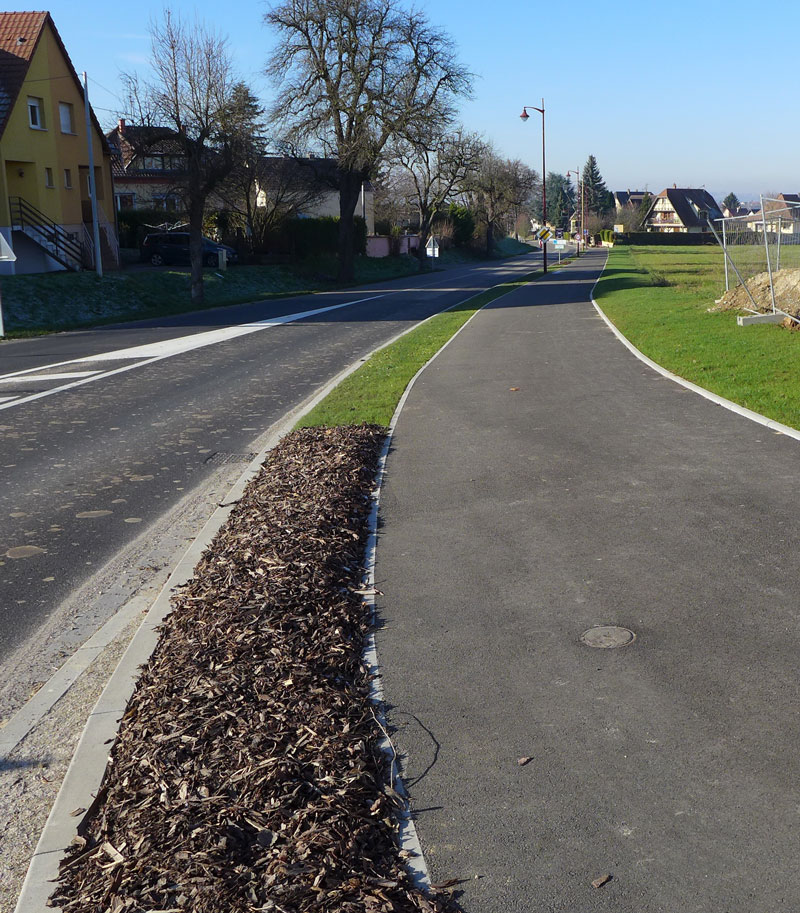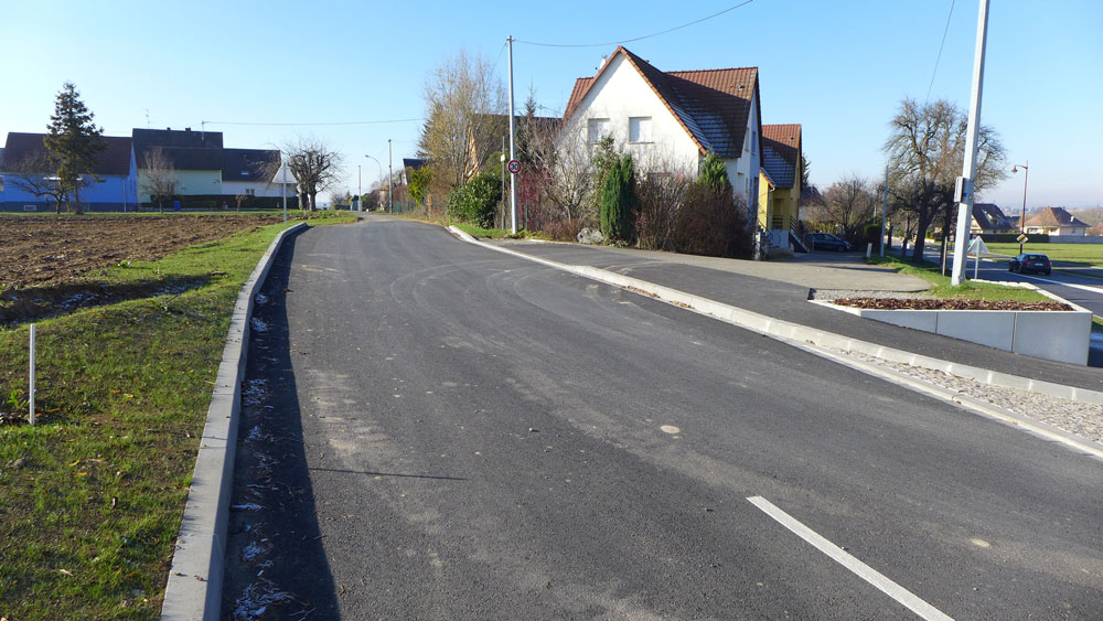 Le nouvel aménagement de l’entrée de Stutzheim : une voie verte, un îlot central et un nouvel accès à la rue des Vergers.