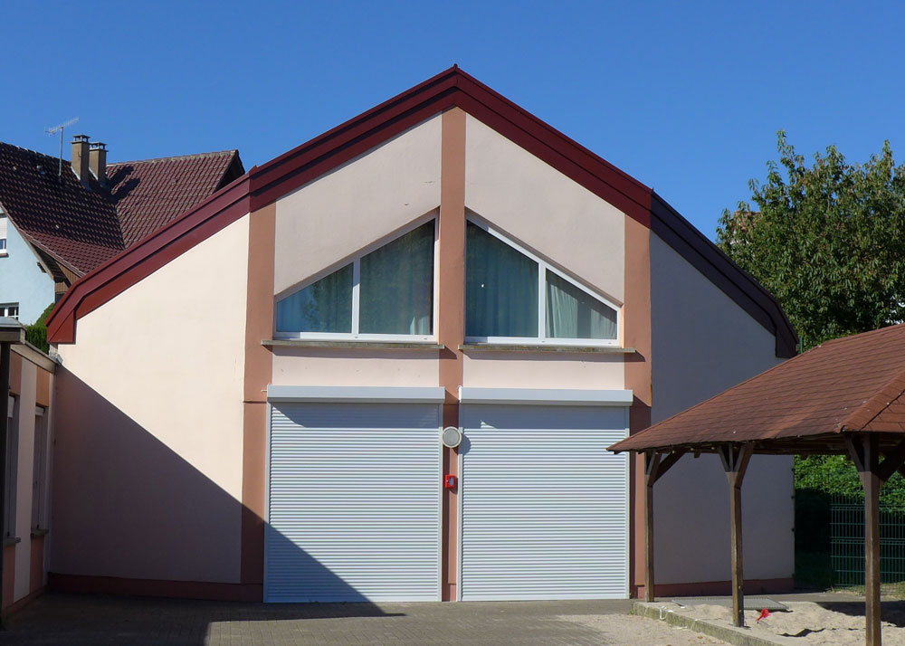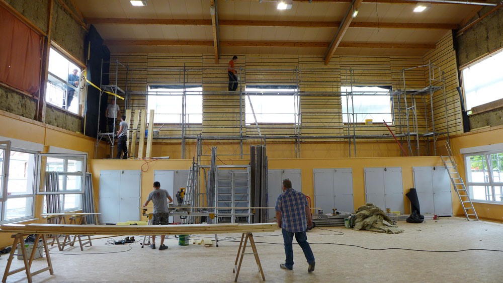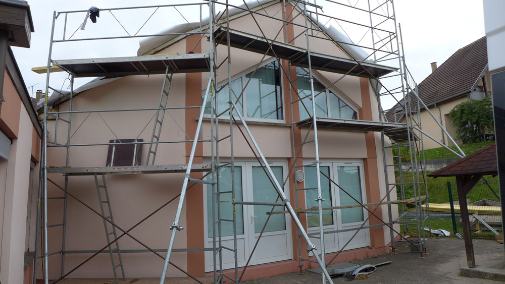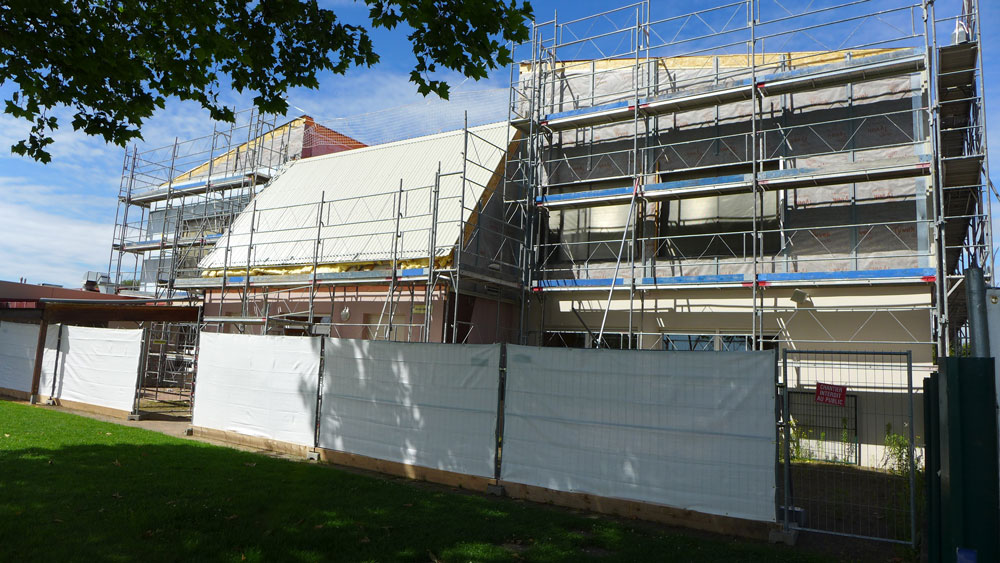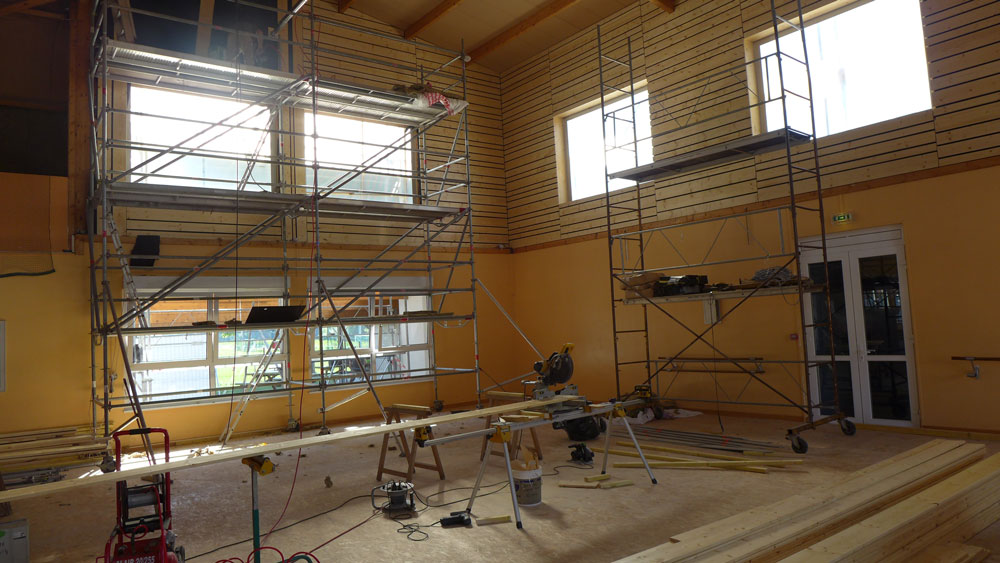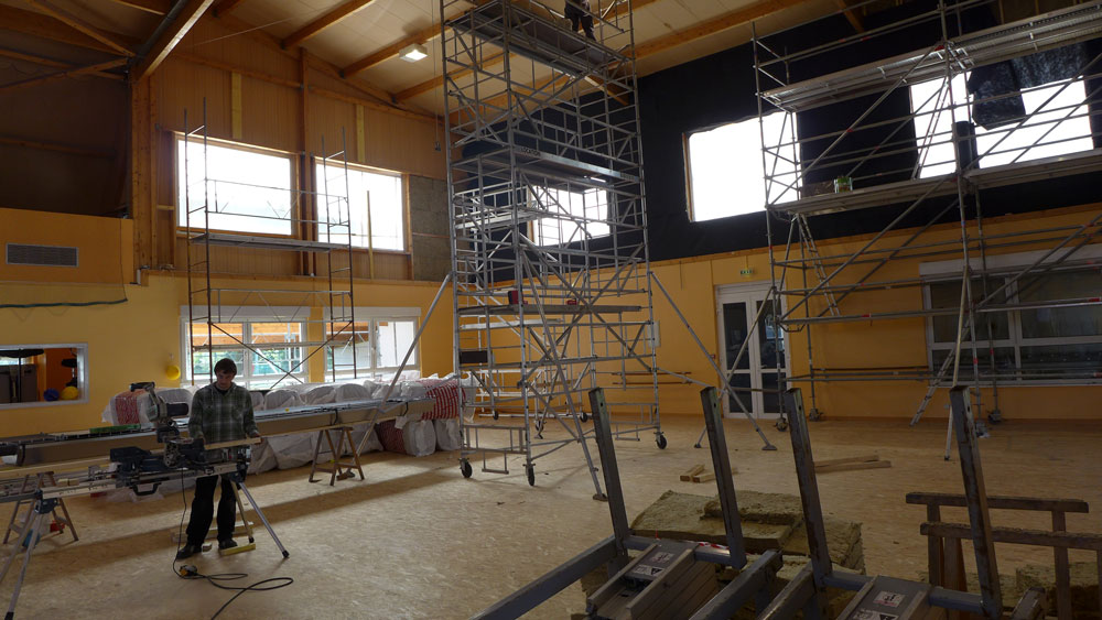 Isolation des murs et de la toiture de la salle des Loisirs - Échafaudage autour de la salle, de mi-avril à fin juillet 2016 - Isolation intérieure et pose d’un bardage en bois - La salle est terminée en août 2016 - Isolation de la toiture de la salle de motricité de l’école maternelle - Inauguration de la salle des Loisirs le 1er octobre 2016.